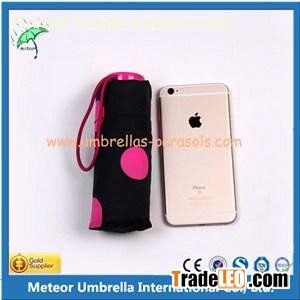 This 5folding umbrella is the smallest in umbrella market, suitable for girls and ladies use, small size easy take, quality light aluminum frame and shaft makes the whole umbrella cute and high level, custom logo printing, custom canopy color acceptable, different designs we also have silver chrome plated or black coated frames.The fabric can be in polyester, pongee, nylonIf you want more different handle chose, please contact our sales department ask for handle catalog pictures.Sample charge:USD50/PCS and it will refund to you when you place an order to us(if we have existing material for the sample can provide sample free in charge), if need to customize any logo on cover or handle will charge you the logo mould charge(it depend on the logo design and size)MODEL5 Folding pocket UmbrellaSIZE21inches x 6ribsframemanual open, light aluminum frame and shaft,HANDLECan be in plastic/rubber/EVAFABRIC190T waterproof pongee canopyCOLORcustomedPRINTINGcustomedPAYMENTT/T 30% as deposit, balance pay when goods accomplished and quality inspectedDELIVERYSea/air/courierMOQ1,000pcsPRODUCTION50,000pcs per monthPACKING12pcs per inner box, 48pcs per master carton. Or customedUSEsun and rain SPECIAL DESIGN FOLDING UMBRELLAUMBRELLA DEscriptION 5 folding smart High Quality POCKET FOLDING UMBRELLA for gifts, brand or promotion use. UMBRELLA FEATURES* Good quality materials. Light umbrella aluminum frame and shaft* High waterproof UV protection umbrella fabric* umbrella in smart size, cute design * umbrella wide use area, both sun and rain * Various umbrella materials for choosing* Durabel and Economy* Professional team* Skillful workers * Easy taking* Umbrella can match with clothes, bagsCONSTRUCTION FOLDING UMBRELLAUmbrella size in 42" Arc Advertising Printed Small Pocket Standard Folding Umbrella ,China Manufacturer,OEM,ODMStylish umbrella —— cool printing design,functionalhigh quality umbrella——choose firm and certificated materialsWe are the professional umbrella manufacturer for all kinds of umbrellaAVAILABLE SIZESWidth: open diameter 95cm, 98cm, 103cm,110cm . (Can be Customized)Length: 16cm/18cm/24cm/28cm/32cm (Can be customized).Custom Sizes: If you need customized sizes or die cut parts please feel free to contact METEOR sales representative.( sales@meteorumbrella.com )OUR SERVICESCustomers would be provided with below services if you are interested in our products.A. Customized order like different styles, designs are all available.B. Professional recommendations on tape choice for customers.C. Free samples available.D. Competitive prices.E. In time delivery.F. Quality assurance.G. After sales services.H. Long term win-win partner concernsOUR ADVANTAGES1. Low MOQ2. OEM and ODM service available.3. Factory sale directly with much competitive price.5. Good Quality Control. There are 3 times quality checking before delivery.6. Free samples are available. Even customized parts are also available. We guarantee that the samples and mass production tapes would be satisfied.7. All of the customers’ samples/orders would be recorded and maintained secrecy. Customers can re-order with convenience and satisfactory.WHY CHOOSE US?1. Here you will find the most competitive factory price which is almost equal to the actual cost.2. We will make a strict time schedule for your order to 100% ensures the timely delivery.3. We can make the tape into the size or shapes as requested.4. You will be kept updated of the production state during the whole production process.5. Over 15 years on the umbrella manufacturing.6. prompt reply within 10 hours.7. Custom logo printing is accepted.Friendly Tips: If you find our umbrellas interesting, please fill the below blank space your detailed requirements. METEOR’s team would offer different solutions to you within 10hours. Free samples are also available. fill your information below :)