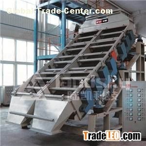 DHMVS Series Equal-thickness Screens.The screens are composed of two sections of screen mesh with different inclination angles. The mesh section at the feeding side has a larger inclination angle, enabling an quicker flow and thin material bed so as to accelerate the penetration of smaller particles, while the section at the discharge side has a smaller inclination angle, enabling a retarded flow and prolonged screening time so as to increase the penetration rate of near-size particles in the material bed. Each section keeps a stable amount-flow ratio, leading to an approximately equal thick material bed on the screen. Equal-thck screening can falilitate material’s forward convery, stratification and penetration. Compared with other models with similar screen areas, equal-thick screens can have a larger throughput and higher screening efficiency.