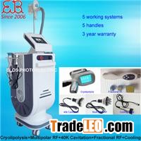 Vertical 5 in 1 Cryolipolysis+Fractional RF+Multi-polar RF+40K cavitation+CoolingModel No.: EB-WL9Main Function of Cryolipolysis+Cavitation+RF:Body slimming,body shaping;Cellulite reduction;Localized fat removal;Lymph drainage;Skin tightening;Pain relief for relaxation;Blood circulation improvement; Main Function of Fractional RF:wrinkle removal and skin rejuvenation;freckle removal and skin whitening;acne removal;skin texture improvement;skin rejuvenation around eye-area5 Working Systems: 5 Handles:Technical Parameter:VoltageAC110V/220V 50-60HzPower400wTemperature-10 °C~10°CPressure output10-Vertical 5 In 1 Cryolipolysis+Fractional RF+Multi-polar RF+40K Cavitation+Cooling