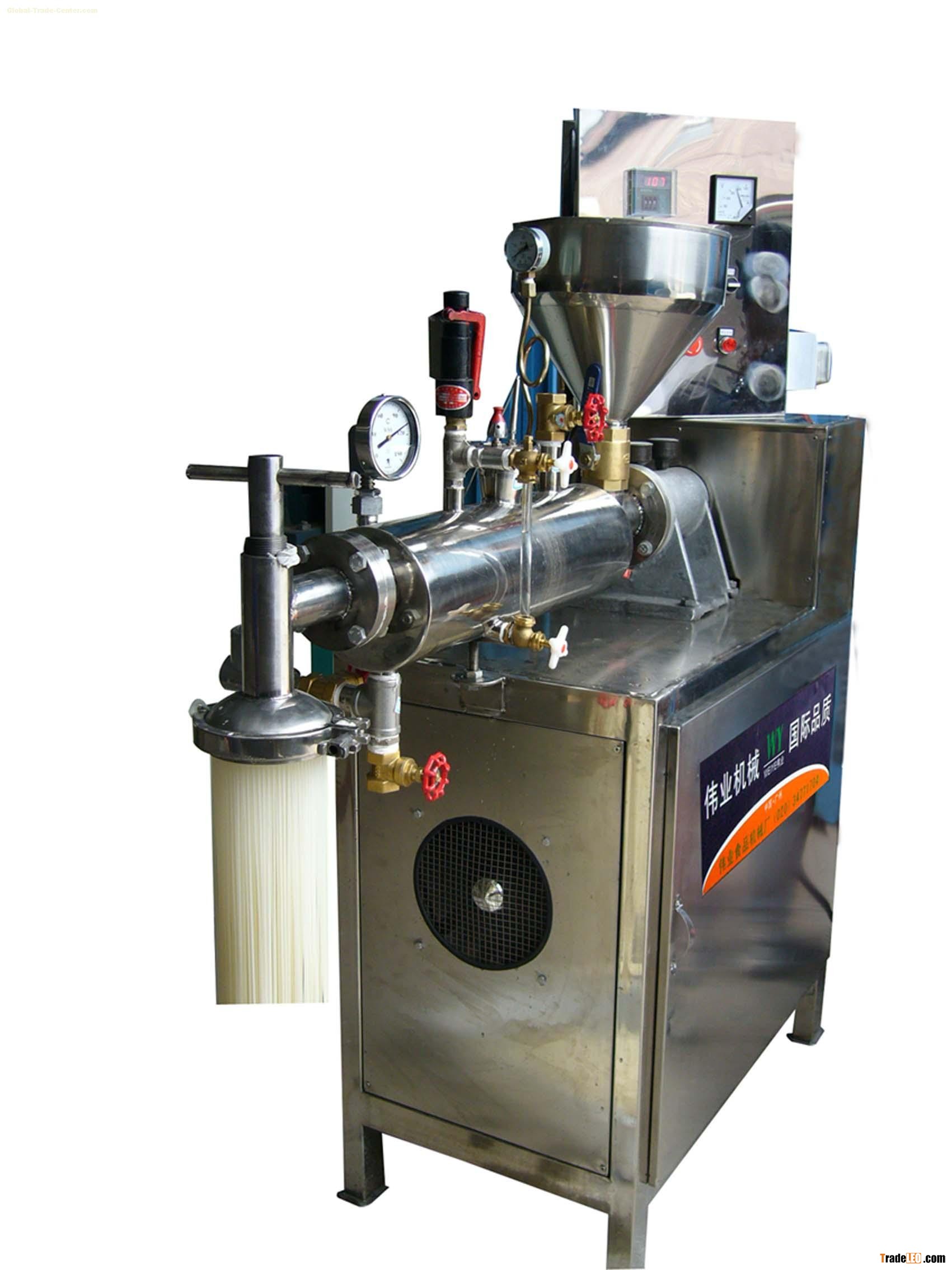Rice noodle machine consists of transmission case, high-speed cooker and low-pressure high-speed extruder. It realizes the production mechanization, raise the productivity, save the energy, and lessen the workers. The produced rice noodle has no break, high slippery and good taste. The material is strongly sterilized with high temperature during the running in the machine, thus the microbe content in the finish product is extremely low, which is convenient for the long period storage.