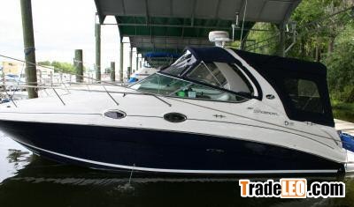 2004 Sea Ray Sundancer including a Loadmaster Aluminum tri-axle trailer with electric over hydraulic SS disc brakes on all 6 wheels and 12000 pound electric winch. This gorgeous blue hulled boat is loaded with all the goodies. Start with twin MerCruiser 5.0 MPI Bravo Three I/O's with only 120 hours .. 5KW Kohler gen set with 100 hours. Smart Craft Electronics, Raymarine C70 Chartplotter, GPS, Depth Sounder, and Radar. Add the windlass, A/C heatpump, battery monitor, trim tab indicator, 6-CD Changer Stereo which is Sirus Ready, Full camper canvas, cockpit cover, remote spotlight, macerator w/seacock, two burner electric cooktop, TV/DVD Combo, VacuFlush head, refrigerator, microwave, and much much more.