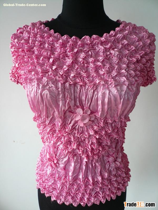 These shirts look great on and have great visual interest. They feature Spike Popcorn at the shoulders and waist with a crinkle texture at the bodice and flounce hem. Flattering tunic length with short sleeves,100%polyester stain.