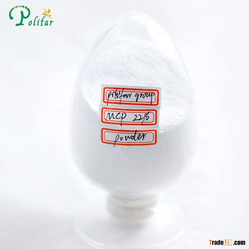 【Description】: POLIFAR brand Monocalcium Phosphate (MCP) is white crystal powder. Easily soluble in hydrochloric acid and nitric acid, soluble in cool water, almost insoluble in alcohol. It loses crystal water at 109 degrees Celsius and decomposes to calcium metaphosphate at 203 degrees Celsius.