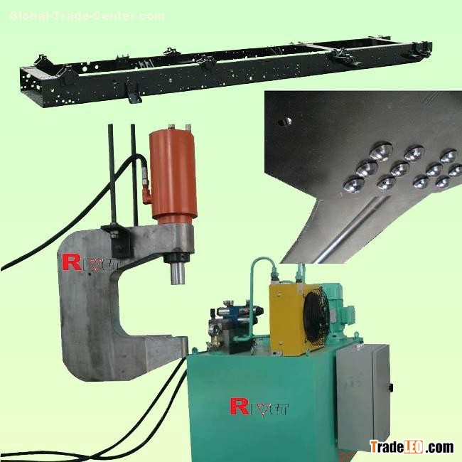In some areas, the common riveting machine can not processing due to the span of workpiece and heavy with large body, at this time you might considering the traveling riveting machine (hydraulic power pack with C-gun, also called it as hanging machine). This machine pressure is powerful and stable during process, after process that the surface are smooth and beautiful.The machine's pressure, speed, system pressure are adjustable to insure the achieve a perfect result.
