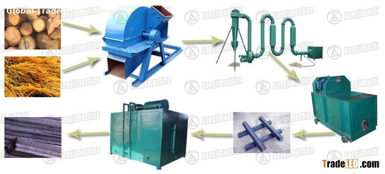 The raw material of machine-made charcoal can be sawdust, straw, rice husks, peanut shells and other agricultural wastes. The mechanism charcoal production flow is breaking&crushing--drying--molding--carbonization--finished charcoal.