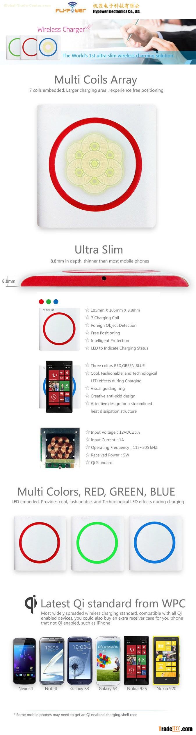 charging distance and over 72% of efficiency. Supporting all QI enabled devices, such as iPhone5, Nokia 9300, N7100, Lumia920, Galaxy Note II, Galaxy 4S, LG Nexus, HTL 8X
