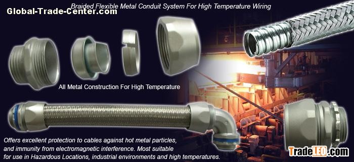 Inherently low fire hazard (ILFH), Braided Flexible metal Conduit is widely used to counter mechanical stress and is highly flexible, and it is resistant against tensile stresses and transverse pressure. This conduit also offers excellent protection to cables against hot metal particles, and immunity from electromagnetic interference. Most suitable for use in Hazardous Locations, industrial environments and high temperatures.