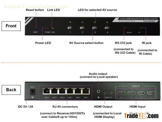 | Supports 4 inputs HDMI sources, 6 outputs cascade-chainable extension over CAT.5e/6.