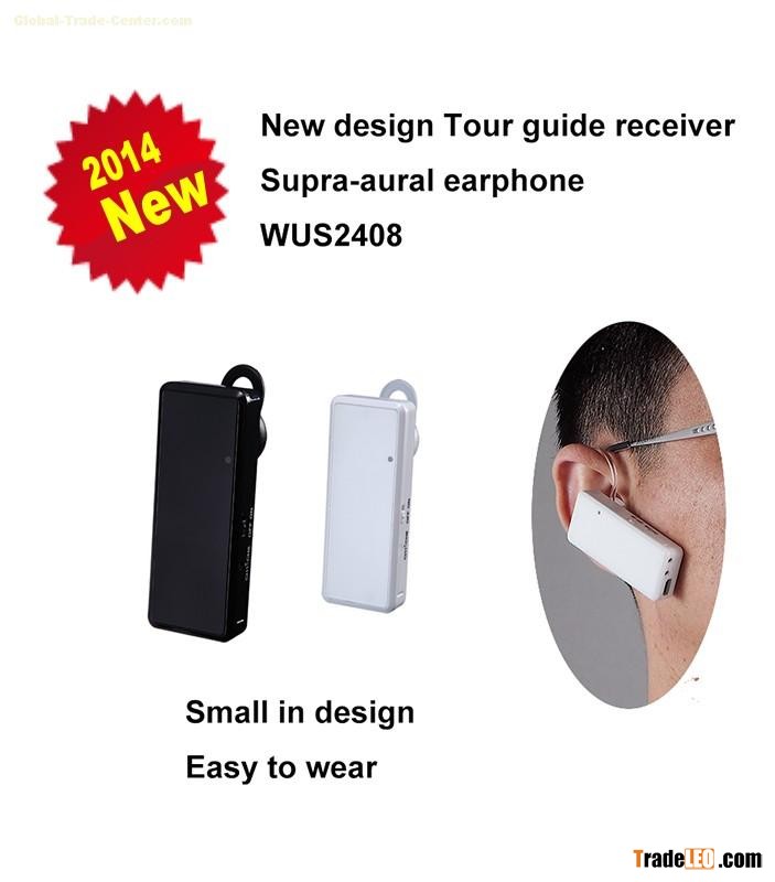 | 2.4Ghz Digital Wireless Tour Guide System Portable Ear-hanging Receiver- WUS2408 WUS2408 is a very compact system for daily tour guiding. The receiver has a size of Bluetooth earphone. It can be hanged on ear and very convenient to use. There is no need to use a wired headphone. The receiver is powered by rechargeable Lithium battery. The battery can last 9 hours per charge. Features: 2.4GHz international free frequency Unlimited wireless receivers for each transmitter. 80 meters transmission distance Battery can last 9 hours. Receiver can auto-scan and find a channel. High-Tech Rechargeable Lithium battery with large capacity. Receiver can be hanged on ear. Lightweight and Portable, comfortable to use and easy to carry. 8- 95 optional independent channels to work at the same location The earphone foam and ear-hook are replaceable. 30-unit charging case is available Specifications: Model No: WUS2408 Frequency band: UHF 2400-2483MHZ Standard: 2.4G digital wireless Weight: 20g including battery Modulation mode: GFSK Control: Volume & Channel Frequency channels: 8-95 channels Frequency response: 29-20KHz Receiving range: up to 150 meters Sampling rate: 48K Shortest latency: <0.5ms Charging time: 4 hrs Battery life: 7-8 hrs talk time per charge Battery charger (WUS028C) With 30pcs charger slot for WUS2408 Competitive advantages: Well and High quality control prompt delivery New products Customers design and logo are welcome In a variety of design Small order acceptable ODM accepted. ODM accepted. 2 years warranty.