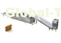 | HT-60 bar product machine Sqima, peanut brittle, cereal bars, rice bars, nut brittle, sesame bar, muesli bar. 1.Our machine is designed according to the European technology and structure. 2.All the structure is made of high quality stainless steel to ensure the good quality and long service life. 3.The conveyor belt is adopted the PP food grade materials to ensure the high food hygiene. Individual electrical box, All electrical parts are from well-known companies. High quality and long service life. 4.The hoppers and pressed rollers are all made of polyvinyl fluoride materials, no stick to syrup, This is widely used in the European machine. |