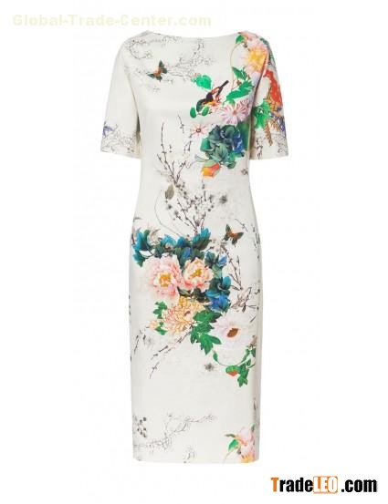 White Short Sleeve Peony and Bird Printed Cheongsam Dress