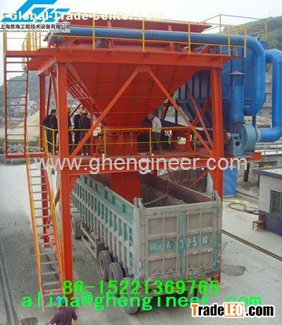 This equipment have two parts, up side parts and down side parts, because open mouth of feeding funnel is larger enough, so it is difficult for it to cause dust. And at the feed opening of hopper, have installed induced draft cover, so that it can avoid too much dust when loading material to trucks. All adsorbent dust will fall back to the parts of feed opening via back flushing of dirt catcher,