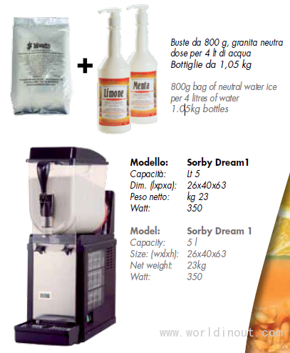 A quick process to obtain only a type of water ice in different tastes? It’s sufficient to use a bag of neutral water-ice basic preparation and to add a dose of syrup in the favoured taste. And the water ice is immediately ready in the following tastes: Ace, apricot, sour black cherry, pineapple, watermelon, anise, orange, banana, coffee, citron, coconut, cola, strawberry, soft fruit, grenadine, lemon, liquorice,green apple, melon, mint, orgeat, peach, grapefruit and tamarind.