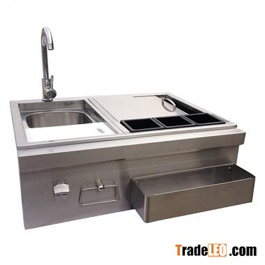 ice bin with drainage system included, three condiment boxes, sink with cold water faucet, cutting board, bottle rail, bottle
