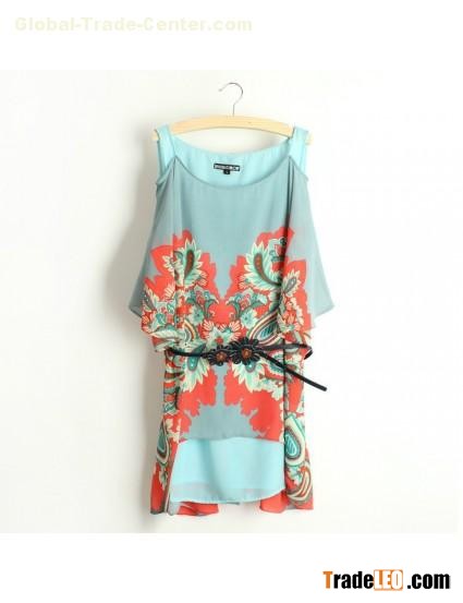 Acid Blue Off-Shoulder Half Sleeve Phoenix Printed Dress