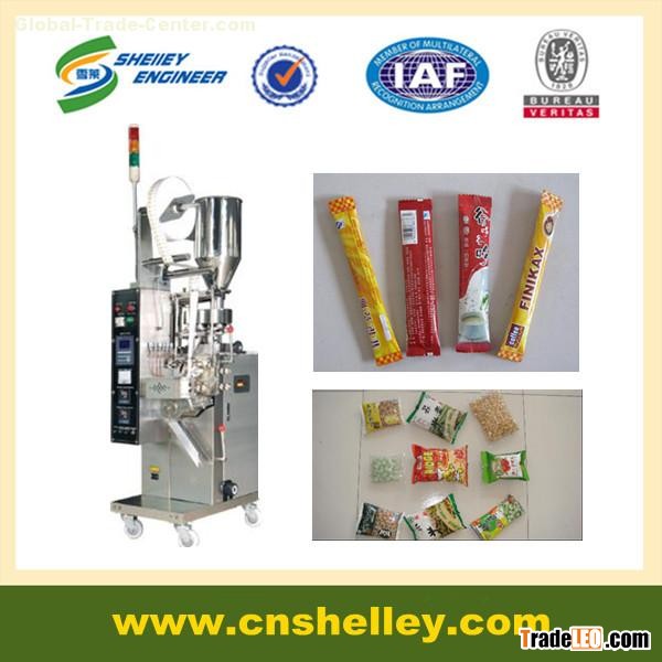 | Small vertical granule packing machine Introduction: The machine is suitable for packing non-sticky granular materials, such as sugar, salt, coffee, washing powder, desiccant, antiseptic, pills, food stuffs, nuts, peanuts, almond, raisins, beans, seeds, rice, feed and so on. The machine can automatically finish the complete processes: measuring, bag making, filling, sealing, cutting, counting and date printing. Packing materials include several kinds of heat seal lamination, such as PET/PE, PET/VMPET/PE, BOPP/VMPET/PE, PET/plated AL/PE and so on. Main Features: