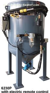 The operator controls blasting from a remote control handle at the nozzle. Pressing the handle starts blasting; releasing it stops blasting.