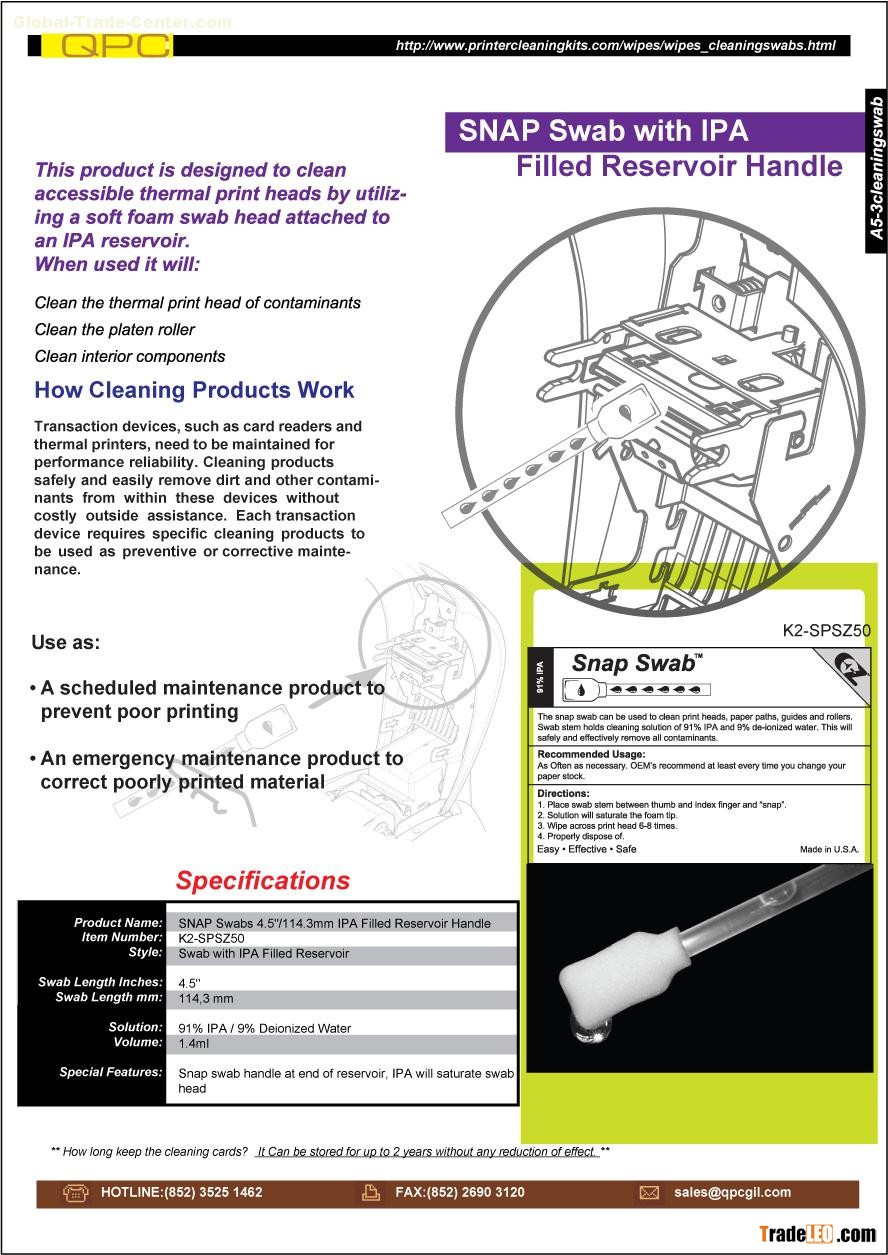 Self-Saturating Swabs The Easy Swab self-saturating foam-tipped cleaning swab is the newest and easiest way to thoroughly clean print heads in PVC card printers and all other thermal printers. Cleaning solution is contained inside the swab, so bottles and messy rags are a thing of the past. To dispense the cleaning solution, the user simply squeezes the swab, and the solution saturates the foam tip. The user then runs the swab over the print head until it is clean Suitable for -print heads in PVC card printers and all other thermal printers. -paper paths -Hotel Door Locks -guides -rollers All Card Readers -ATM/POS Terminals -Petroleum Pump -Time/Badge -Slot/Vending -Optical/Barcode -Smart Card