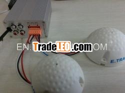 *APM210 two-way adaptor applied to monitor includes two 12V DCstabilized power supply, two groups of volume adjustors andsingle-way sound output mixed by two-way.