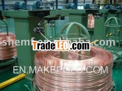 The oxygen free copper rod upwardcontinuous casting rolling machine is capable of producingdirectly from cathode to bright and long oxygen-free copperrod , copper tube, flat copper bar and other special shaped coppermaterial . As compared with the black copper rod produced bytraditional mangler from copper ingot, the rod produced by this newup-ward continuous casting technology has its advantage of betterquality, low production cost, low investment and no pollution inproduction. The composition of thesystem 1,Inductionfurnace The induction furnace is consist of furnace body, furnace frame andinductor. The outside of the furnace body is steel structure andthe inside is consist of fire-clay brick and quartz sand. Thefunction of the furnace frame is support-ing the whole furnace. Thefurnace is fixed on the base by the foot screw. The inductor ismade up of coil, water jacket, iron core and copper-ring. There arecoils with water-jacket at the high voltage side. The voltage isadjustable step by step from 90V to 420V.There are short-circuitcopper rings at the low-voltage side. After set up an electriccircuit, it can emerge big current flow in the copper ring with theelectromagnetic induction. The big current flow can melt the copperring and electrolytic copper putted into the furnace. The waterjacket and coil is cooled by the water. The cooling water iscycling and supplied by the cooling watersystem. 2.Continuouscasting machine Thecontinuous casting machine is the main part of the system. It isconsist of drawing mechanism, following mechanism of liquid leveland freezer. The drawing mechanism is made up ofA.C. servo motor, two groups of drawing rollers and so on..It canproduce 0-1000 times interval rotation per minute and draw up thecopper rod continuous by the drawing rollers. One of the drawing mechanisms can drive 5 drawing rollers and draw up 5 copperrods.The following mechanism of liquid level guarantee that thedeep of the freezer inserting into the copper liquid is relativestable.The freezer can cool the copper liquid into copper rod byheat exchange. Every freezer can be changed and controlledalone. 3, frame of guide pulley Theframe of guide pulley is installed above the continuous castingmachine. It is consist of platform, support, vertical guide pulleyand cylinder. It can lead the copper rod to the every double-headwind machine without disturbance. 4,Limited device The caging device are two devicesinstalled between the frame of guide pulley and double-head windmachine. It is fitted with 5 groups of 24V up and down spacingwhich can control the speed of double-head wind machine by theelectrical signal produced by the copper rod touching the up ordown spacing. 5,Double-head windmachine The double-head wind machine ismade up of the drawing rollers, revolving chassis and spoolingtake-up unit. Every double-head wind machine can take-up two copperrods. 6,Cooling-watersystem
