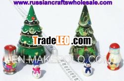New Year Wooden Tree, Wood Handcarved Matrioshka Ded Moroz Snowman Russian Crafts Ethnic Folk Art