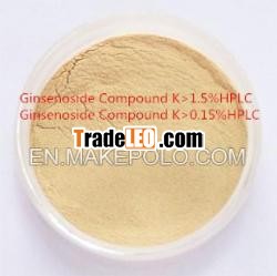 Product Name: Ginsenoside Compound K Latin Name in Botany: Panaxginseng C.A. Meyer Family: Araliaceae Genus: Panax Used Part: RootIntroduction: Ginsenoside is the main pharmacological activeingredient of panax ginseng and its the same family plants (Panaxnotoginseng, American ginseng, etc.). It has been separated morethan 40 kinds of ginseng saponin monomer. Ginsenoside CK belongs todiol-type saponins, which is very low in natural ginseng. But it isthe main degradation products and the final absorptional form ofother high content ginsenosides, like ginsenoside Rb1 and Rb2, ect.Ginsenoside CK has a high biological activity. Character: Brownyellow powder Available specifications: 1, 1.5% HPLC, apply tospecial foods and cancer patients 2, 0.15% HPLC, apply to generalfood The advantages of Ginsenoside CK: 1. "Natural prodrug" theoryhas been confirmed Ginsenoside CK is the entity of Ginsenosidesactive role. The existing research shows that the anti-tumoractivity and enhance immune of Ginsenoside CK is the strongest ofall ginsenosides; 2 Ginsenoside CK ginsenosides is the mostsuitable to use as anti-tumor development in all ginsenosides. Ithas a good solution, while ginsenoside Rg3, Rh1, Rh2 are in poorwater solubility. For cancer patients, once into the conventionaltreatment, digestive function was completely lost. Preparations fororal absorption level is very limited. But ginsenoside CK can bemade into injection, with its good water solubility, to play adirect role. 3 Ginsenoside CK, intervening specific antineoplastictreatment programs, is help to build efficient cancer treatmentmodalities, to explore the existing treatments and therapeuticpotential. The existing studies have shown that ginsenosides CKindeed has a good synergistic effect attenuation for somefirst-line anticancer drugs. Pharmacological functions: 1anti-tumor: Following is the main points of Ginsenoside CKanti-tumor mechanism: A inhibition of tumor cell proliferation; Bto promote tumor cell apoptosis; C inhibition of tumor cellinvasion and metastasis; D to improve chemotherapy sensitivity oftumor cells, reducing its impact on normal cells side effects 2anti-diabetic, regulate blood sugar 3 immunomodulatory 4anti-allergic, anti-inflammatory 5 anti-hypertensive 6 SkinMoisturizer Applications: Pharmaceutical raw materials, Healthproducts, Food and Beverages, Cosmetics