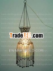 Beautiful Hanging Glass lamp pot with pendantsAn amazing glass Lamp. It has clear glass color. The body iscovered by finely ornamented oxidized brass (Crescents Design). Itis decorated by multiple hanging chains that end withpendants.