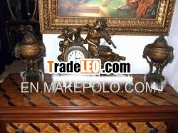 French mantel clock garniture setBeautiful French mantel clock garniture setconsists of a beautiful hand crafted bronze clock with a matchingof a lovely pair of cassolettes with beautiful bronze garlanddetails, the clock depicts a cherub & a musician lady plays ona violin and the cherub holds the musical note for her, the clockis based on a white marble base, the pair of cassolettes as wellwith Roman numerals on an Enamel dial center.