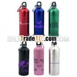 This 25 oz / 739 ml stainless steel water bottle comes with acarabiner on the screw-top lid. The dimensions are 9.25h x2.75d.