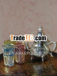 Moroccan tea set includes teapot, tea tray silver and few teaglasses.