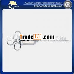 Flavorinjector Material: stainless steel orcopper Printing:laserprinting Packing: 12pcs/box,24pcs/carton Capacity:1oz, 2oz, and4oz Add flavor directly into yourroast Turkey or chicken with thisingenious stainlees steel marinade injector. The 3 ring handle makes it easyto fill and inject using just one hand. product pictures: Packing: theother marinade injectors we produce: