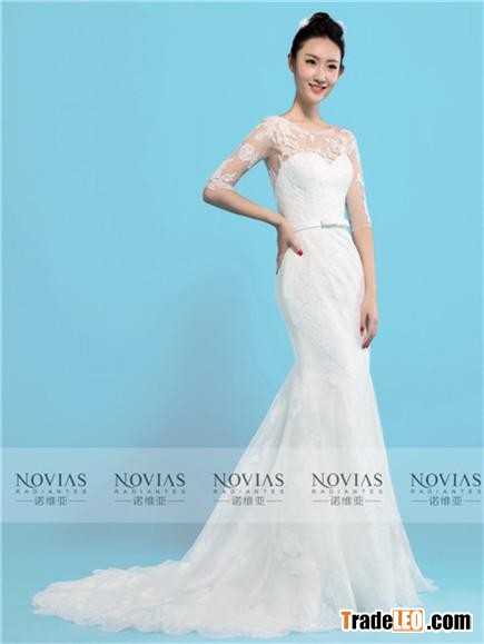 Off shoulder long sleeves A-line lace wedding dress with beaded belt and chapel train
