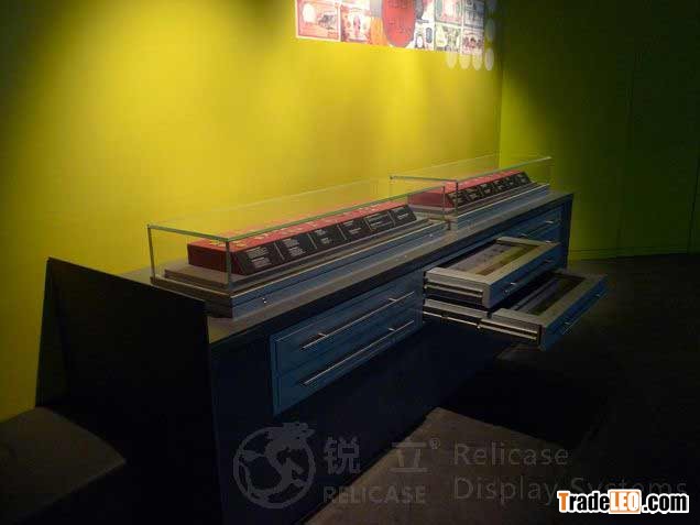 The perfect combination of look-down display and high-security storage at the same time. These high-specification drawers are produced in folded steel and powder-coated to finish within a metal extrusion frame for all-round security. Individual drawers rests on dedicated pulleys for easy opening and closing. External or internal lighting systems are available. A micro-switch sensor allows lighting to be switched on only when each drawer is open to prevent long exposures of light-sensitive exhibits to artificial light. Applicable to high density or compact display and storage.Relicase Storage Systems
